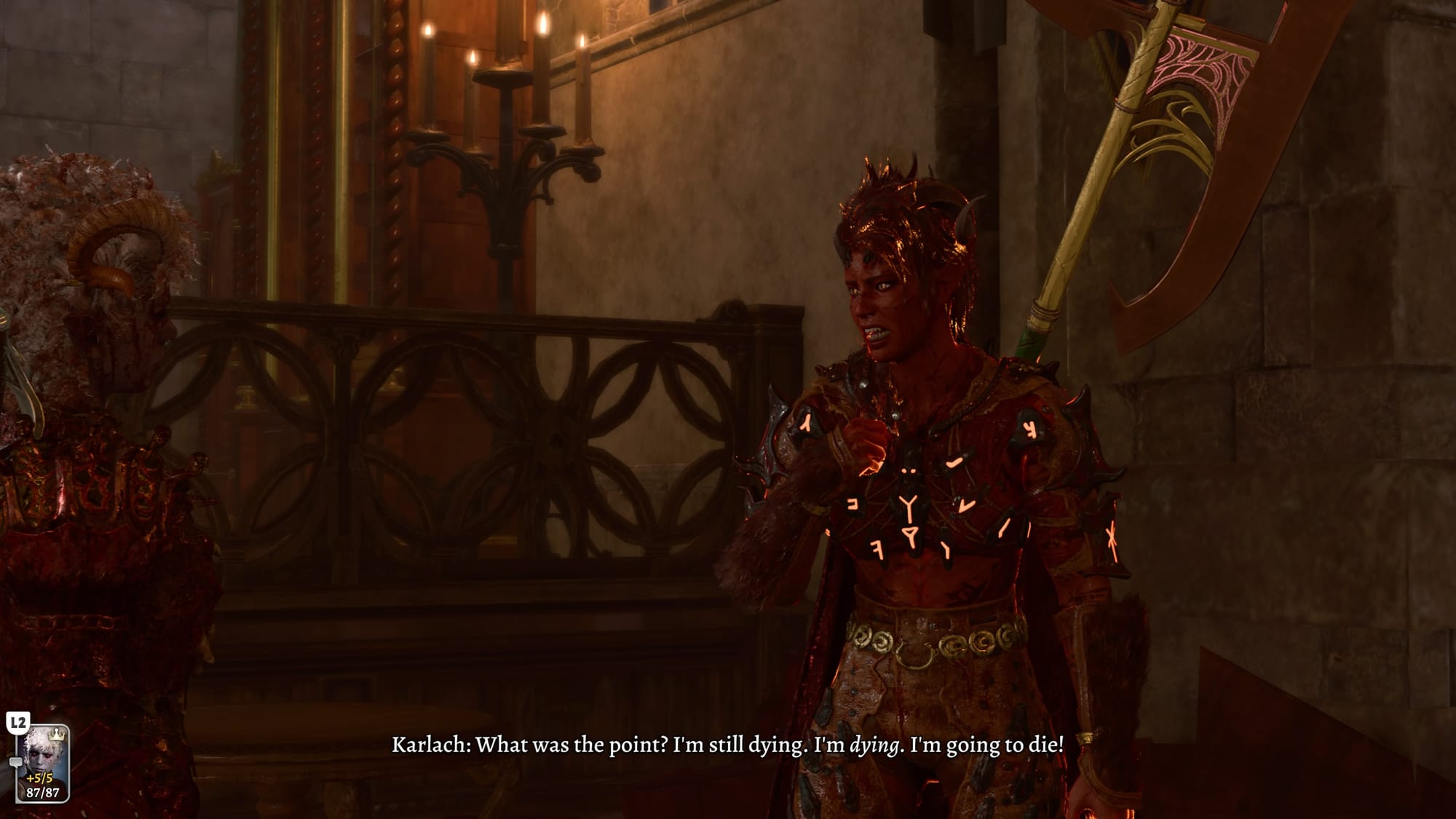 Thorm is not the only one to rage against the dying of the light. After Karlach kills Gortash, the man responsible for her own imminent death, she immediately realises that her attempt at reasserting control neither solved her problem nor relieved her anger and grief at the injustice of her condition: