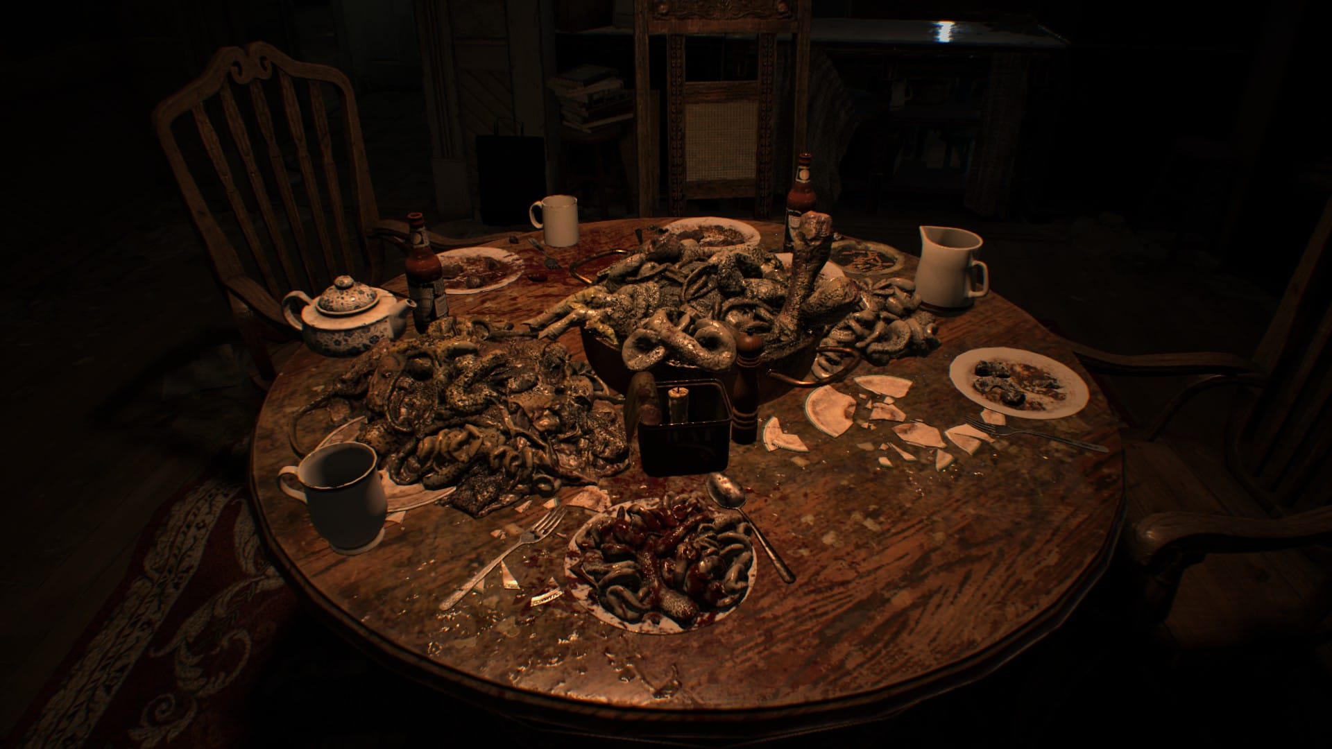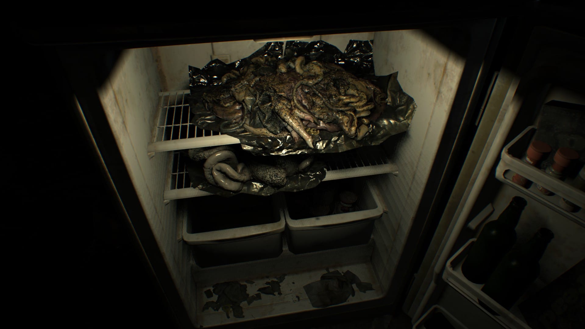 I recently picked up Resident Evil VII, and unsurprisingly, revolting meat and animal cadavers play a rather substantial part in it. It’s no secret that it takes its cues from one of my favourite horror films, Tobe Hooper’s The Texas Chainsaw Massacre (1974). Its remote, dilapidated farm house, its cannibalistic hillbilly family, its chainsaws and meat hooks; they all have their unmistakable echoes in RE VII. These tropes have become icons, and RE VII wears them proudly on its sleeve. And, on the surface at least, it uses them to great effect. RE VII is thrilling, terrifying, gory, revolting, and utterly over the top.