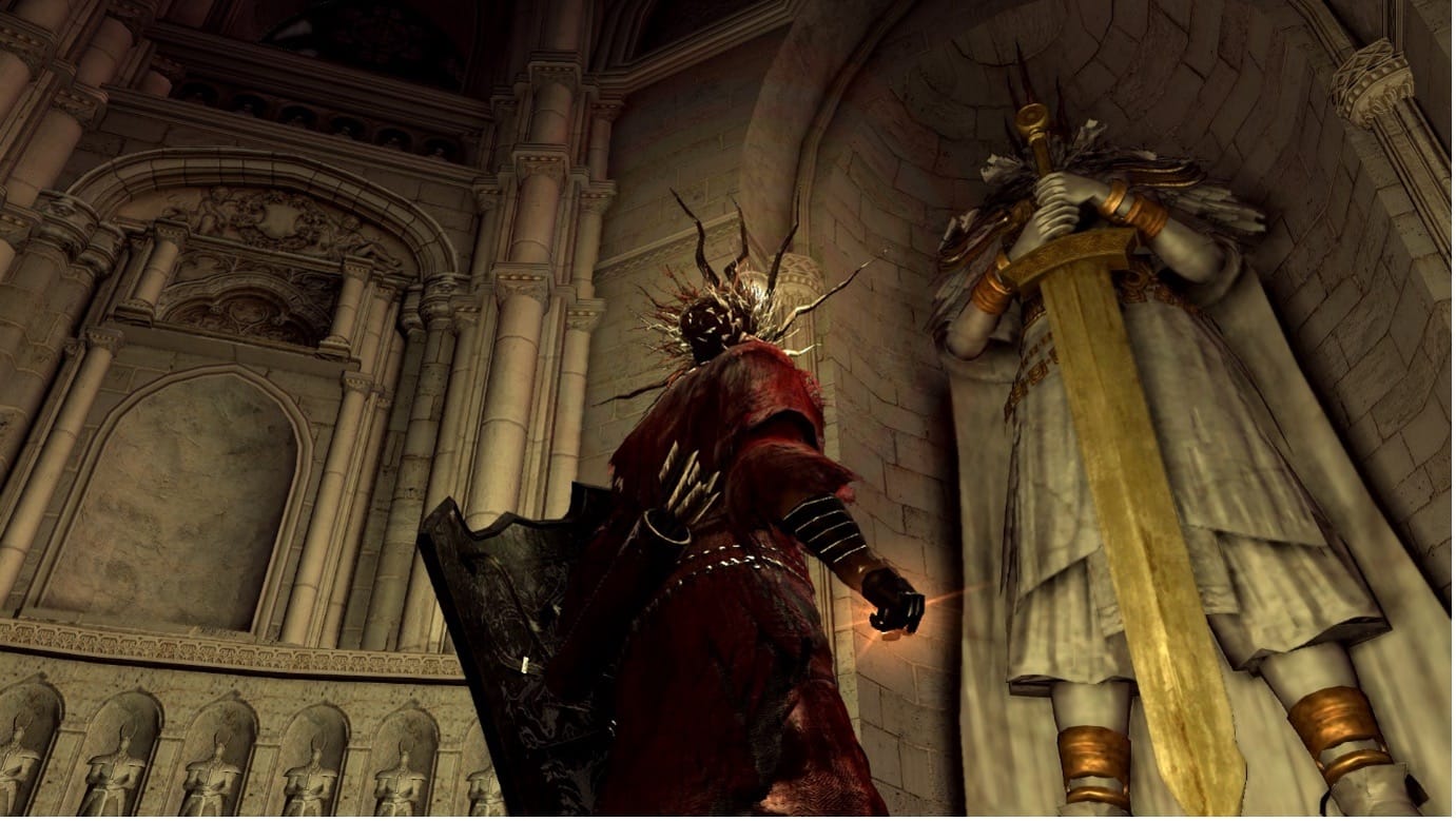 This is where the ritual nature of Dark Souls, and yet another example of its brilliance, comes in. Being a game, it is up to the player to enforce and right the violated laws of this cosmos, whether by (re)kindling the bonfires or killing Lord Gwyn. Playing Dark Souls, with its deliberate pacing and repetition, eventually comes to have ritualistic aspects because, despite this world's harshness, there’s a comfort and purpose in going through the familiar motions time after time. We gladly start a New Game + after killing Gwyn not because the world will be thrillingly unfamiliar (as it would be in, for example, a roguelike) but precisely because everything stays much the same, and we look forward to the repetition and to overcoming the sun god yet again.